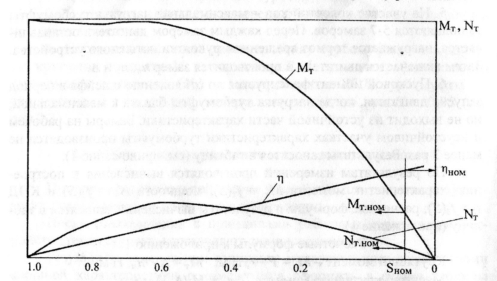 Рис. 1.3. Схема экспериментального стенда для испытания турбомуфты Рис. 1.4. Внешняя характеристика турбомуфты Порядок проведения опытов следующий 1. Включается аппаратура в такой последовательности: стабилизатор напряжения, блок питания осциллографа НО41У4.2, осциллограф, усилитель ТА-5. Производится настройка усилителя, балансировка измерительного моста, проверяется начальное положение световых «зайцев» гальванометра. 2. Измерительное звено нагружается грузами 5...25 кг (через 5 кг)и выполняются замеры отклонения луча гальванометра. Тарировка производится не менее трех раз при нагружении и разгрузке тензозвена, Результаты заносятся в таблицу (см. приложение 1). 3. Вращением рукоятки натяжного устройства производится полное ослабление каната тормоза. Включается двигатель и выполняютсязамеры числа оборотов насосного и турбинного колес, и нагрузки на валу двигателя (турбомуфты) на холостом ходу. 4. При работающей турбомуфте производится энергичное вращение рукоятки натяжного устройства вплоть до выявления зоны начала неустойчивой работы турбомуфты; двигатель отключается, фиксируется число оборотов рукоятки натяжного устройства для перевода турбо муфты из режима холостого хода в режим максимальной нагрузки; обратным вращением рукоятки тормоз возвращается в ослабленное состояние. 5.На участке «холостой ход - максимальная нагрузка» турбомуфты выполняются 5-7 замеров. Перед каждым замером двигатель останавливается, нагружается тормоз вращением рукоятки натяжного устройства. Затем включается двигатель и производится замер nн, nТ и 6.Пусковой момент фиксируется по отклонению шлейфа в период запуска двигателя, когда нагрузка турбомуфты близка к максимальной, но не выходит из устойчивой части характеристики. Замеры на рабочем и неустойчивом участках характеристики турбомуфты производятся не менее 3 раз. Результаты заносятся в таблицу (см. приложение 1). По результатам измерений производятся вычисления к построению характеристик момента Mr = f1(S), мощности NT = f2(S) и КПД Расчетные формулы к таблице 1.2 Крутящий момент - МТ = F • r, Нм; МТ = Масштаб крутящего момента -тн= М т/ Скольжение турбомуфты -S = (nH- nT)/nH. Угловая скорость турбинного колеса - Мощность на валу турбинного колеса -NT = MT КПД турбомуфты - Производятся построения внешних характеристик турбомуфты, оцениваются ошибки измерений. Ориентировочная форма внешних характеристик турбомуфты приведена на рис. 1.4.