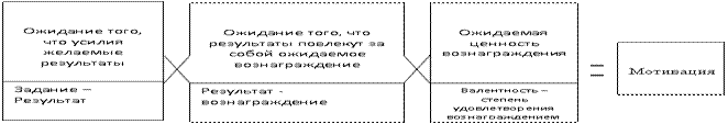 Основной вклад в развитие процессуальных теорий внес В.Врум. В основе его работы лежит теория ожиданий, суть которой схематично отражена на рисунке 19. Эта теория основана на предположении, что человек направляет свои усилия на достижение какой-либо цели только тогда, когда уверен в большой вероятности удовлетворения своих потребностей. Каждый «блок ожиданий» в схеме отражает усилия менеджера по мотивации работника. К процессуальным теориям можно также отнести теорию справедливости.