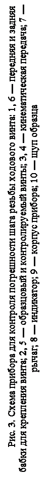 Для определения погрешности шага резьбы ходового винта используют прибор БВ-542, схема которого представлена на рис. 3. Принцип работы этого прибора основан на непрерывном сравнении винтового движения образующих контролируемого и образцового винтов.
