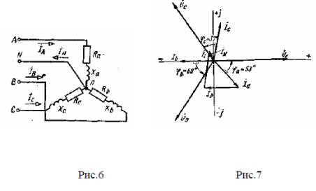 При изучении этого раздела особое внимание необходимо обратить на преимущество, которые дает трехфазная система по сравнению с однофазной. Рассматривая схемы соединения обмоток генераторов, надо уяснить связь между фазными и линейными напряжениями в схеме соединения звездой, а также связь между фазными и линейными токами в схеме соединения треугольником. Необходимо четко представить, что в трехфазной цепи могут быть два режима: симметричный и несимметричный. Расчет трехфазной цепи в симметричном режиме сводится к расчету для одной фазы и производится аналогично расчету однофазной цепи с одним источником. Трехфазная цепь может рассматриваться как разветвленная цепь с тремя источниками питания, и для ее расчета применяются методы, используемые при расчете электрических цепей с несколькими источниками. Например, если несимметричный приемник соединен без нейтрального провода, то для расчета трехфазной цепи можно применить метод узлового напряжения в комплексной форме. После изучения настоящего раздела студенты должны: 1) знать основные элементы трехфазной цепей, способы соединения фаз обмотки генератора и включения в трехфазную цепь приемников; способы изображения трехфазной симметричной системы э.д.с; 2) понимать роль нейтрального провода; принципы построения потенциальных диаграмм; влияние рода и схемы включения нагрузки на величину тока в нейтральном проводе, схемы электроснабжения предприятия; 3) уметь анализировать различные режимы симметричных и несимметричных цепей; читать схемы соединения трехфазных и однофазных приемников; предвидеть последствия коммутационных изменений в цепи на ее электрическое состояние. Задача 3. В четырехпроводную трехфазную сеть с линейным напряжением Ù л=220 В включен звездой приемник, активные и индуктивные сопротивления фаз которого соответственно равны Rа=3 Ом, Ха=4 Ом, Rб=3 Ом, Хб=5, 2 Ом, RC=4 Ом, ХС=3 Ом, (рис. 6). Определить токи в линейных и нейтральном проводах и построить векторную диаграмму. Решение. Считаем, что вектор фазного напряжения Ù а= Ù л/ 3 =127 В, Ù б= 127е – j120° В, Ù с= 127е j120° В. Находим линейные токи: İ а= Ù а/Zа= 127/(3+j4)=127/(5е j53°) =25, 4е – j53° А; İ б= Ù а/Zб= 127е – j120°/(3+j5, 2) =127е – j120°/ (6е j60°)= 21, 2e –j180° А; İ с=Ù с/Ζ с=127еj120/(4+j3)=Uc