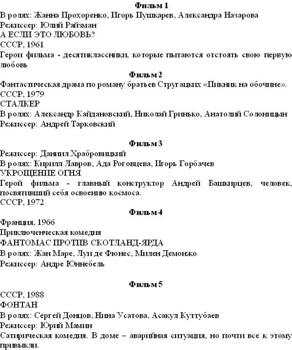 Лабораторная работа №1 Тема: «Основные приемы редактирования и форматирования текста» Цель занятия: приобрести практические навыки по созданию и форматированию текста MS Word. Отрабатываемые вопросы: 1.Изучение приемов работы в среде Word. 2.Выполнение сортировки данных. 3.Работа со списками. Организационно-методические указания 1. Загрузите Word 2007 и ознакомьтесь с видом окна редактора, его ленточным интерфейсом с инструментами. Лента имеет несколько вкладок, переход между которыми выполняется щелчком мыши по их названиям. Названия вкладок размещаются над лентой и заменяют собой строку меню. Каждая из вкладок ленты содержит группу инструментов. Наводя курсор мыши на каждую кнопку, можно изучать их функции. При необходимости вызывайте Справку. 2. Установите поля Вашего документа: верхнее, нижнее и левое – 2, 5 см, правое – 2 см, используя вкладку Разметка страницы, Параметры страницы, Поля. 3. Введите исходный текст, приведенный ниже (обратите внимание, что Word автоматически разбивает текст на строки, то есть не нужно нажимать клавишу Enter в конце каждой строки). Нажимайте эту клавишу только в том случае, если необходимо начать новый абзац. Выполните сортировку данного текста точно в соответствии с образцом (см. Задание 1 в конце данной работы), используйте следующий порядок строк для каждого из 5 фильмов, указанных ниже: Название фильма; Страна, год создания; Режиссер фильма; В ролях; Краткая аннотация фильма. 4. Набрав первую строку, сохраните документ на своем носителе. Чтобы сохранить текстовый документ, используйте команду Сохранить как, нажав кнопку “ Office”, расположенную в верхнем левом углу экрана.В диалоговом окне дайте название документу, напримерkino4-05.docx, где 4 – номер группы, а 05 – ваш порядковый номер по списку. По умолчанию документ сохраняется в папке Мои документы, можете сохранить свой документ в своей папке. При наборе текста постоянно применяйте быстрое сохранение, что позволит избежать потерь при сбое в работе компьютера. Внимание! Один щелчок левой клавишей мыши на полосе выделения выделяет строку, удерживая нажатой левую клавишу мыши, Вы можете выделить группу строк. Два щелчка левой клавишей мыши на полосе выделения выделяют абзац, напротив которого находится указатель мыши. Если Вы хотите выделить одно слово, то дважды щелкните по нему левой клавишей мыши. В результате выполнения данной работы созданный файл должен иметь вид, представленный в Задании №1. Исходный текст