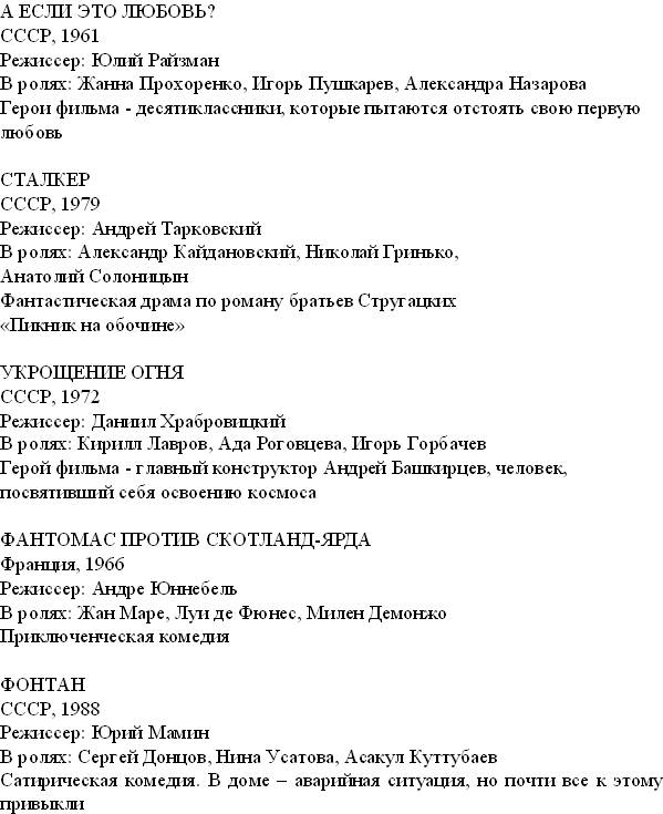 Задание № 2 Фильмы: А ЕСЛИ ЭТО ЛЮБОВЬ? 2. СТАЛКЕР 3. ТРАКТИР НА ПЯТНИЦКОЙ 4. УКРОЩЕНИЕ ОГНЯ 5. ФОНТАН 6. ЦВЕТЫ КАЛЕНДУЛЫ 7. Я ШАГАЮ ПО МОСКВЕ