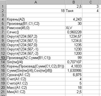 Тема: «Изучение типовых функций табличного процессора» Цель занятия: приобрести практические навыки использования математических, статистических и логических функций. Отрабатываемые вопросы: 1. Математические и статистические функции. 2. Логические функции. Организационно-методические указания. 1.Научиться пользоваться математическими и статистическими функциями. 1.1.Создайте таблицу, приведенную на рис.1. 1.2.Ввести в столбец «B» функции, указанные в столбце «А» и сравнить полученные результаты с данными, приведенными в столбце «В» на рис.1. 1.3.Проанализировать результаты и сохранить созданную таблицу в книге.