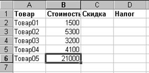Лог_выражение - любое значение или выражение, принимающее значения ИСТИНА или ЛОЖЬ. Например, A10=100- логическое выражение. Если значение в ячейке A10 равно 100, то это выражение принимает значение ИСТИНА, а в противном случае - значение ЛОЖЬ. Этот аргумент может использоваться в любом операторе сравнения (см. “Справку”). Выполните данный пример: ЕСЛИ(А10=100; «Правда»; «Неправильно») Измените значение в ячейке А10 на другое, посмотрите результат и объясните причину изменений. 2.1.Ввести таблицу, приведенную на рис.2. 2.2.В ячейку С2 введите формулу для вычисления значения Скидка, используя функцию ЕСЛИ и скопируйте формулу в диапазон ячеек (С3: С6): · если стоимость товара < 2000, то скидка составляет 5% от стоимости товара; · в противном случае - 10%.