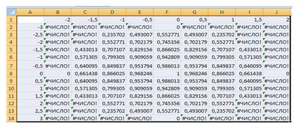 1.2.Ввести значения переменных х (по вертикали), начиная с ячейки А2 и у (по горизонтали), начиная с ячейки B1: · в ячейку А2 вводится первое значение аргумента (х = –3), затем в ячейку A3 вводится второе значение аргумента (х = –2, 5) и, выделив блок ячеек А2: АЗ, автозаполнением получаем все значения аргумента х (за правый нижний угол блока протягиваем до ячейки А14). · значения переменной у вводим в строку 1. Для этого в ячейку В1 вводится первое значение переменной (у = –2), в ячейку С1 вводится второе значение переменной (у = –1, 5), а затем, выделив блок ячеек В1: С1, автозаполнением получаем все значения аргумента (за правый нижний угол блока протягиваем до ячейки J1). 1.3.Вычисление значений функции z. Для этого курсор необходимо поместить в ячейку В2 и вызвать Мастер функций. В появившемся диалоговом окне Мастер функций - шаг 1 из 2 слева в поле Категория выбираем Математические, в поле Функция выбираем функцию Корень и нажимаем кнопку ОК. В диалоговом окне Корень в рабочем поле вводим подкоренное выражение: 1 - $А2^2/9 - В$1^2/4. Обратите внимание, что символы $ предназначены для фиксации адреса столбца А - переменной х истроки 1 - переменной у. Нажимаем кнопку ОК и в ячейке В2 появляется «#ЧИСЛО!», так как при значениях х = –3 и у = –2 точек рассматриваемого эллипсоида не существует (рис 1.).