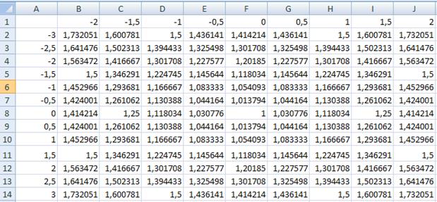 2.2.Введем значения переменной х в столбец А. Для этого в ячейку А1 вводим символ x, в ячейку А2 вводится первое значение аргумента х = –3, а в ячейку A3 - второе значение аргумента х = –2, 5. Затем, выделив блок ячеек А2: АЗ, автозаполнением получаем все значения аргумента (за правый нижний угол блока протягиваем до ячейки А14). Значения переменной у вводим в строку 1. Для этого в ячейку В1 вводится первое значение переменной у= –2, в ячейку С1 - второе значение переменной у = –1, 5, а затем, выделив блок ячеек В1: С1, автозаполнением получаем все значения аргумента (за правый нижний угол блока протягиваем до ячейки J1). 2.3.Вычисление значения переменной Z. Для этого табличный курсор необходимо поместить в ячейку В2, вызвать Мастер функций, в поле Категория выбрать Математические, в поле Функция выбираем функцию Корень и нажимаем кнопку ОК. В рабочее поле вводим подкоренное выражение: 1 + $А2^2/9 + В$1^2/4 инажимаем кнопку ОК. В ячейке В2 появляется 1, 732051. Теперь необходимо скопировать функцию из ячейки В2. Для этого автозаполнением (протягиванием вправо) копируем эту формулу вначале в диапазон B2: J2, после чего протягиванием вниз - в диапазоне ВЗ: J14. В результате должна быть получена таблица точек гиперболоида (рис.3.):