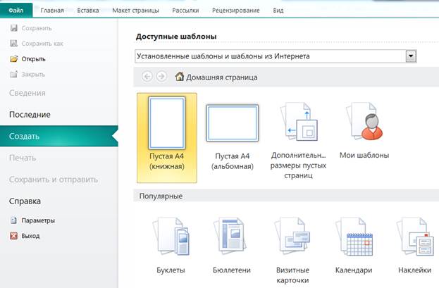 Когда вся предварительная работа выполнена, можно приступать к созданию буклета. Для этого открыть Microsoft Office Publisher и выбрать Пустая А4 (альбомная) в доступных шаблонах (рис.10).