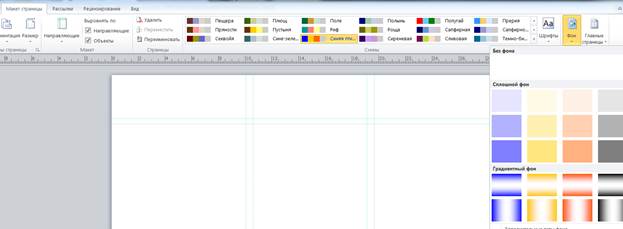 Рисунок 13. Заготовка буклета. Теперь необходимо определиться с цветовой гаммой фона. В качестве фона можно вставить изображение (оно должно быть достаточно однотонное, без резких смен цветов, иначе текст будет плохо различим) или воспользоваться встроенными палитрами (рис. 13) на ленте Макет страницы список Фон. Когда тип выбран, можно изменить цветовую палитру.