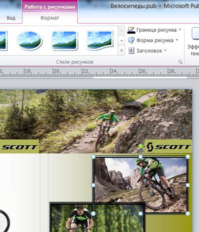 Рисунок 24. Добавление иллюстраций на внутреннюю часть буклета. Далее остается добавить выбранный текст, логотип фирмы на каждую часть и поэкспериментировать с рамками для иллюстраций (рис.25).