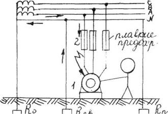 Нулевой провод присоединен к корпусу защищаемого оборудования. При появлении на корпусе напряжения возникает однофазное короткое замыкание между фазным и нулевым проводом. По цепи: фаза - корпус - нулевой провод течет большой ток короткого замыкания, в результате чего срабатывает плавкий предохранитель - 2 или автоматический выключатель. До срабатывания защиты зануление понижает напряжение на корпусе электродвигателя.