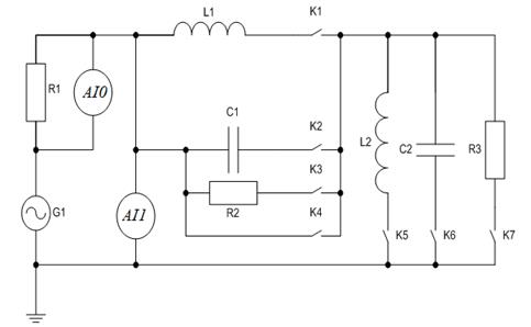 Принципиальная схема, используемая в данной лабораторной работе, приведена на рисунке 1.2. С помощью ключей K1 — K7 выбирается вариант ДП.