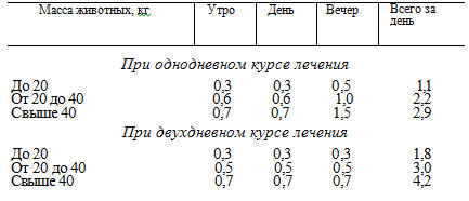Двухдневный курс проводят с лечебной целью при значительной зараженности свиней аскаридами, а однодневный — для профилактики при выявлении в стаде отдельных свиней, зараженных аскаридами. Поросят дегельминтизируют кремнефтористым натрием не ранее чем через 10 дн. после отъема. Не разрешается дегельминтизировать поросят-сосунов, а также маток за месяц до опороса и в первую неделю после него. В дни дегельминтизации уменьшают норму кормов до 70— 80 % рациона, слабительные средства не назначают, воду не ограничивают. Фтористый натрий дают в дозе 0, 1 г/кг после предварительной 12-часовой голодной диеты поросятам и в дозе 0, 05 г/кг взрослым свиньям. Поросят дегельминтизируют индивидуально. Препарат помещают в изолированную кормушку в смеси с запаренным или увлажненным кормом (отруби, ячменная дерть и др.); количество корма не должно превышать 150 г. Иногда после применения препарата в лечебной дозе у поросят начинается рвота. Поэтому перед дегельминтизацией и после нее выпаивать им воду не разрешается. Давать животным фтористый натрий в чистом виде на корень языка нельзя, так как снижается эффективность дегельминтизации и возможно попадание препарата в легкие, что может вызвать осложнение и смерть животного. Кормят поросят не ранее чем через 6—8 ч после дегельминтизации. Сантонин назначают в дозе 0, 05 г/кг с каломелем (0, 03 г/кг) после предварительной 12-часовой голодной диеты (табл. 2).