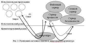В некоторых случаях разработчики ОС отступают от этого классического варианта архитектуры, организуя работу ядра и приложений в одном и том же режиме. Так, известная специализированная операционная система NetWare компании Novell использует привилегированный режим процессоров Intel x86/ Pentium как для работы ядра, так и для работы своих специфических приложений — загружаемых модулей NLM (рис. 3.5). При таком построении ОС обращения приложений к ядру выполняются быстрее, так как нет переключения режимов, однако при этом отсутствует надежная аппаратная защита памяти, занимаемой модулями ОС, от некорректно работающего приложения. Разработчики NetWare пошли на такое потенциальное снижение надежности своей операционной системы, поскольку ограниченный набор ее специализированных приложений позволяет компенсировать этот архитектурный недостаток за счет тщательной отладки каждого приложения. В одном режиме работают также ядро и приложения тех операционных систем, которые разработаны для процессоров, вообще не поддерживающих привилегированного режима работы. Наиболее популярным процессором такого типа был процессор Intel 8088/86, послуживший основой для персональных компьютеров компании IBM. Операционная система MS-DOS, разработанная компанией Microsoft для этих компьютеров, состояла из двух модулей msdos.sys и io.sys, составлявших ядро системы (хотя название «ядро» для этих модулей не употреблялось, по своей сути они им являлись), к которым с системными вызовами обращались командный интерпретатор command.com, системные утилиты и приложения. Архитектура MS-DOS соответствует архитектуре ОС, приведенной на рис. 3.2. Некорректно написанные приложения вполне могли разрушить основные модули MS-DOS, что иногда и происходило, но область использования MS-DOS (и многих подобных ей ранних операционных систем для персональных компьютеров, таких как MSX, СР/М) и не предъявляла высоких требований к надежности ОС. *************************************************************** Суть микроядерной архитектуры состоит в том, что в привилегированном режиме работает только микроядро, в состав которого входят машинно-зависимые модули и часть базовых функций ядра. Утилиты и обрабатывающие программы вызываются в основном пользователем. Исключительные ситуации обслуживания приложением запросов других приложений обрабатываются специальными модулями, называемыми серверами ОС, поэтому необходимым условием реализации микроядерной архитектуры является наличие эффективного способа вызова процедур одного процесса из другого процесса. Поддержка этого механизма – главная задача микроядра. Реализация системного вызова в микроядерной архитектуре изображена на рис. 6.