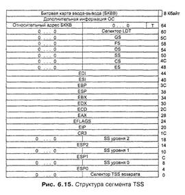 2.В TSS текущей задачи сохраняются значения регистров процессора. На текущий сегмент TSS указывает регистр процессора TR, содержащий селектор в сегмента. 3.В TR загружается селектор сегмента TSS задачи, на которую переключаетепроцессор. 4.Из нового TSS в регистр LDTR переносится значение селектора таблицы LDT в таблице GDT задачи. 5.Восстанавливаются значения регистров процессора (из соответствующих полей нового сегмента TSS). 6.В поле селектора возврата нового сегмента TSS заносится селектор сегмента TSS снимаемой с выполнения задачи для организации возврата к ней в будущем.