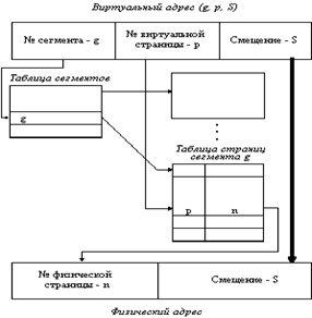 Метод представляет собой комбинацию сегментного и страничного распределения памяти и, вследствие этого, сочетает в себе достоинства обоих подходов. Виртуальное пространство процесса делится на сегменты, а каждый сегмент в свою очередь делится на виртуальные страницы, которые нумеруются в пределах сегмента. Оперативная память делится на физические страницы. Загрузка процесса выполняется операционной системой постранично, при этом часть страниц размещается в оперативной памяти, а часть на диске. Для каждого сегмента создается своя таблица страниц, структура которой полностью совпадает со структурой таблицы страниц, используемой при страничном распределении. Для каждого процесса создается таблица сегментов, в которой указываются адреса таблиц страниц для всех сегментов данного процесса. Адрес таблицы сегментов загружается в специальный регистр процессора, когда активизируется соответствующий процесс. На рисунке 7 показана схема преобразования виртуального адреса в физический для данного метода.
