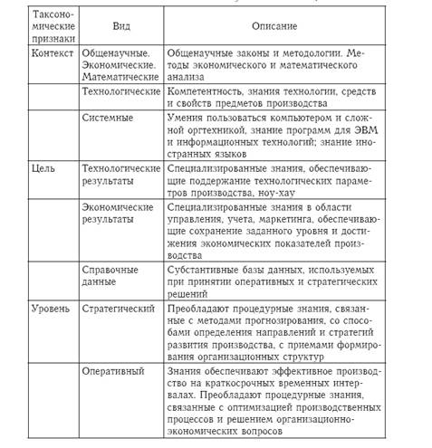 Сл.48 Как видно из табл. 3.1, в зависимости от конкретной ситуации отдельные интеллектуальные ресурсы могут одновременно являться и активами, имеющими соответствующие балансовые цены и имущественные права, и авуарами, не обладающими такими свойствами. При этом необходимо исходить из того, что авторские права, патенты и другие объекты индивидуальной собственности в рамках фирмы могут выступать как структурный актив после их приобретения фирмой у владельцев. Концепции структуризации знаний в экономическом отношении определяются тем, что они являются ядром интеллектуального потенциала. В случае интеллектуального потенциала можно применить понятие «корпоративные знания». Корпоративные знания — совокупность общенаучных и специальных знаний, производственного опыта и навыков, баз знаний и данных, используемых в интеллектуальном потенциале фирмы для получения экономических и технологических результатов. В корпоративных знаниях выделяют нормативные знания - руководства по использованию средств и предметов труда, ноу-хау, технологические инструкции и т. п. Другую группу знаний — дескриптивных, образуют общенаучные и специальные знания. В корпоративных знаниях можно выделить следующие типы специальных знаний: экономические, математические, отраслевые и технологические знания. При этом общенаучное знание «пронизывает» все виды специальных знаний. Особые свойства экономического знания в интеллектуальном потенциале заключаются в том, что в отличие от общенаучных, они рассматривают достаточно узкий диапазон искусственных систем и деятельность человека как экономического агента, вместе с тем и по тем же причинам захватывают более широкую область, чем традиционные технологические и отраслевые знания. Сгруппированные по конкретным признакам названных научных и технологических знаний на твердых или электронных носителях, они образуют тематические базы знаний (библиотеки). Структура и описание корпоративных знаний, включаемых в каждую группу, представлены в табл. 3.2. Таблица 3.2 Таксономия знаний в интеллектуальном потенциале