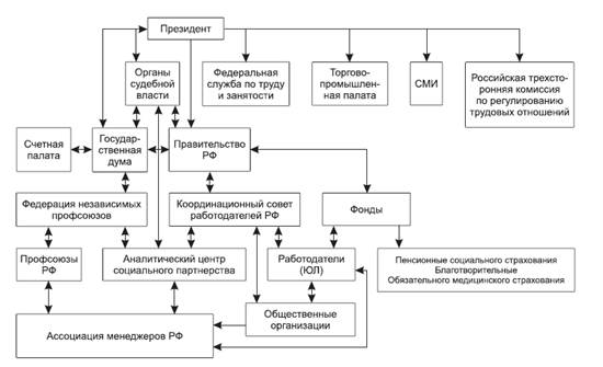 Работодатели в социальных отношениях представлены множеством юридических лиц, осуществляющих производственно-хозяйственную деятельность. Координация их взаимодействия в отношениях социальной ответственности проводится координационным советом работодателей Российской Федерации с участием множества общественных организаций работодателей. Среди них находятся Союз общественных объединений предпринимателей и арендаторов России, Союз работодателей машиностроения и атомной энергетики, Российский союз химиков, Российская ассоциация подрядных организаций в дорожном строительстве, Союз промышленников и предпринимателей угольной промышленности, Российский автотранспортный союз, Агропромышленный союз России, Союз судовладельцев, Союз лесопромышленников и лесоэкспортеров России, Всероссийский союз предпринимателей малого и среднего бизнеса, Конгресс российских деловых кругов. В структуре государственных органов управления активными центрами в вопросах социальной ответственности являются: Комитет по труду и социальной политике Государственной думы, Министерство здравоохранения и социального развития РФ, Российская трехсторонняя комиссия по регулированию социально-трудовых отношений, Министерство финансов РФ. Регулирование социально-трудовых отношений в среде института социальной ответственности осуществляется в формах политики оплаты труда, режима работы, условий занятости, коллективных договоров между администрацией и трудовыми коллективами (индивидуальные и коллективные, соглашения), закрепляющих обязательство условий о порядке деятельности договаривающихся сторон в зависимости от экономических возможностей организаций. Учитываются нормативные положения и законодательные акты регулирования отношений социальной ответственности на уровне организаций (профессии, отрасли, территории, субъекта РФ, Федерации). На уровне административно-территориальных и муниципальных образований в составе субъектов РФ заключаются территориальные соглашения между соответствующими профессиональными союзами и их объединениями, объединениями работодателей, органами местного самоуправления об условиях труда, социальных гарантиях и льготах, связанных с территориальными особенностями города (района), административно-территориального образования. Некоторые крупные российские компании активно демонстрируют приверженность требованиям внешней социальной ответственности. Например, ежегодно дочерние общества крупнейшей нефтяной компании ТНК-ВР заключают Соглашения о социально-экономическом развитии в Новосибирской, Омской, Тюменской областях и Ямало-Ненецком автономном округе. Основные средства при этом направляются на следующие программы: — «Поддержка образования и раскрытие потенциала молодежи»: ремонт школ, финансирование социально-досуговых мероприятий, конкурсов, социально-полезных грантов и инициатив и т. д.; — «Социальная поддержка населения»: социальная поддержка ветеранов и тружеников тыла, финансирование объектов социальной инфраструктуры, строительства жилья и т. д.; — «Сохранение культурного и исторического наследия»: финансирование культурных программ, выставок, музейных экспозиций, строительство дома культуры, памятников погибшим на войне и т. д.; — «Формирование здорового поко