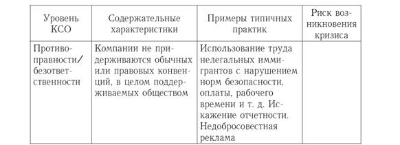 а) Вопросы для подготовки и обсуждения: 1. Концепция и основные факторы устойчивого развития организации. 2. Сущность и принципы устойчивого развития организации при реализации корпоративной социальной ответственности. 3. Деловая репутация как результат корпоративной социальной ответственности организации. 4. Формирование деловой репутации, ее оценка контактными группами. 5. Виды деловой репутации, ее проявление в гудвилле. 6. Деловая репутация как фактор устойчивого развития организации. 7. Роль корпоративной социальной ответственности в антикризисном развитии организации. 8. Реагирующая и стратегическая корпоративная социальная ответственность. 9. Корпоративная социальная ответственность как элемент анти кризисной стратегии организации. 10. Разнообразие типов социальной ответственности. 11. Оценка корпоративной социальной активности. б) Упражнение Определите возможные риски возникновения кризиса в зависимости от уровня корпоративной социальной ответственности, согласно данным таблицы: