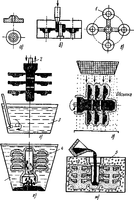 Рис. 11.5. Схема изготовления формы по выплавляемым моделям: а — готовая деталь; б — изготовление модели; в — блок моделей; г — нанесение суспензии; д —обсыпка песком; е — удаление моделей; ж — заливка расплава