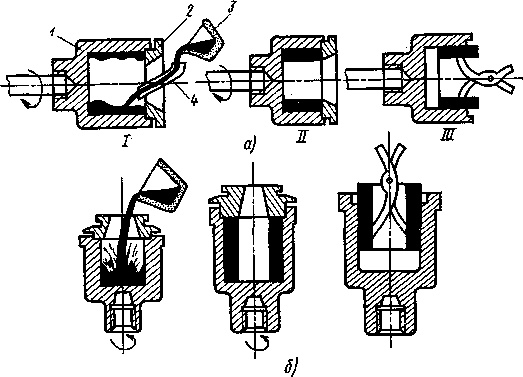 Высокая производительность процесса (100—150 отливок в час при массе около 1 кг), сложность и высокая стоимость оснастки определяют применимость способа литья под давлением в крупносерийном и массовом производствах. Центробежное литье. Сущность этого способа заключается в том, что под действием центробежных сил, которые больше гравитационных, залитый во вращающуюся форму расплав равномерно распределяется по ее внутренней поверхности; после затвердевания образующиеся отливки имеют форму тел вращения (цилиндров, колец, труб). Металлические формы при центробежном литье называются изложницами; изготовляют их из стали или чугуна. Когда наружные поверхности отливок имеют сложную форму (выточки, пояски и т. п.), применяют металлические формы, футерованные изнутри песчано-глинистой или песчано-смоляной смесью. Нанесение футеровки осуществляется формовкой по модели или накаткой роликом. При литье жаропрочных и титановых сплавов используют оболочковые формы из быстротвердеющих смесей. Их изготовляют по выплавляемым моделям, засыпают снаружи опорным материалом после установки в контейнере, последний закрепляется на столе центробежной машины. При отливке могут применяться песчаные стержни. Для регулировки теплового режима на рабочие поверхности изложницы после предварительного ее подогрева (до 200°С) наносят слой огнеупорного покрытия, как и при кокильном литье. Иногда наносят химически активные покрытия (ферросилиций, графит, алюминиевый порошок) с целью изменения свойств поверхностного слоя отливки. Последовательность изготовления отливок на центробежных машинах с горизонтальной и вертикальной осями вращения форм показана на рис. 11.9, а, б. После подготовки изложницу 1 (рис. 11.9, а) закрывают крышкой 2 и заливают расплавом через желоб 4 из ковша 3. Позиция I соответствует этапу заливки расплавом вращающихся форм, II — формирования и затвердевания отливок, III — извлечения готовых отливок из форм с помощью захватов или толкателей. Машины с горизонтальной осью вращения применяют для производства отливок— труб диаметром от 50 до 1500мм и длиной 4...5м, можно также отливать различные втулки, кольца и т. п. Отливки фасонные (втулки, кольца и др.) с размерами по диаметру, превышающими высоту, получают на машинах с вертикальной осью вращения. Центробежное литье является производительным способом, хорошо поддающимся механизации и автоматизации. Этот вид литья обеспечивает изготовление отливок массой от нескольких граммов до нескольких тонн.