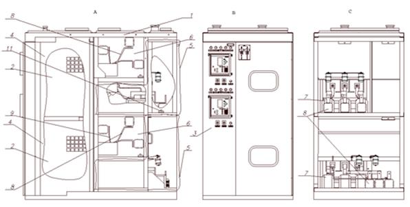 Рис.9 Шкаф КРУ Как правило, шкаф (ячейка) КРУ разделён на 4 основных отсека: 3 высоковольтных — кабельный отсек (ввода или линии), отсек выключателя и отсек сборных шин и 1 низковольтный — релейный шкаф. · В релейном отсеке (3) располагается низковольтное оборудование: устройства РЗиА, переключатели, рубильники. На двери релейного отсека, как правило, располагаются светосигнальная арматура, устройства учёта и измерения электроэнергии, элементы управления ячейкой. · В отсеке выключателя (4) располагается силовой выключатель или другое высоковольтное оборудование (разъединительные контакты, предохранители, ТН). Чаще всего в КРУ это оборудование размещается на выкатном или выдвижном элементе. · В отсеке сборных шин (6) располагаются силовые шины (8), соединяющие шкафы секции РУ. · Отсек ввода (5) служит для размещения кабельной разделки, измерительных трансформаторов тока (7), трансформаторов напряжения, ОПН. Заводами изготавливаются ячейки комплектных распределительных устройств разного назначения, которые подразделяются: · по функциональному назначению - вводные, линейные, собственных нужд, трансформаторов напряжения и проч.; · по типу вводных и отходящих линий - для воздушного ввода или вывода, для кабельного ввода или вывода; · по назначению - общего назначения, для питания экскаваторов, для электротранспорта и т.д. · по типоисполнению - для одиночного применения и для встраивания в сборку КРУ; · по типу установки - для применения внутри помещений и для наружного применения (КРУН); · по величине номинального тока; · по конструктивному исполнению видимого разрыва (в целях безопасности работы на линиях) - разъединителямии коммутационного аппарата в выдвижном исполнении (на тележке). Для различия ячеек одного типа и марки, но имеющие разное функциональное назначение (иногда и разный тип ввода или вывода)завод - изготовитель присваивает им каталожные номера.