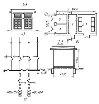 а — общий вид, б — план, в — схема; 1 и 2 — помещения для РУ 6 — 10 и 1 кВ, 3 — ячейки трансформаторов