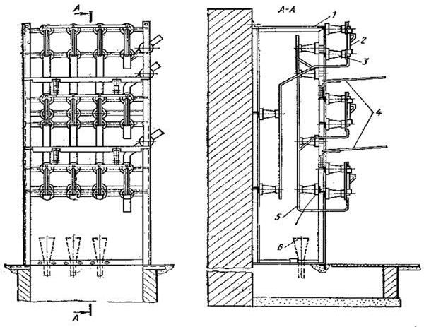 | Блокировку выполняют с помощью специальных замков, устанавливаемых на приводах выключателей и разъединителей, или путем устройства системы рычагов, не позволяющих отключить приводы разъединителей при включенном выключателе. Рис. 8.Сборка с однофазными разъединителями на напряжение 6-10 кВ (на четыре присоединения): 1 - каркас, 2 - разъединитель, 3 - опорный изолятор, 4 - перегородки из асбестошифера, 5 - шины, 6 - концевая кабельная заделка В распределительном пункте имеются также реле защиты, измерительные приборы, устройства автоматики, заземляющие устройства, освещение. Трансформаторная подстанция, схема которой представлена на рис. 7, состоит из сборных шин 1, разъединителей 2, предохранителей 3, силовых трансформаторов 4 и распределительного устройства 5 на напряжение 0, 4/0, 23 кВ с предохранителями ПР и ПН 6 на 0, 4/0, 23 кВ. Шины, разъединители и предохранители размещают в камерах или на сборках 6-10 кВ. Сборка на четыре присоединения показана на рис. 8. Она представляет собой стальную каркасную конструкцию 1, на которой установлены разъединители 2, опорные изоляторы 3 и шины 5. В нижней части каркаса крепят кабельные концевые заделки 6. Между разъединителями установлены горизонтальные изоляционные перегородки 4 из листового асбестошифера толщиной 6-8 мм. В проектах типовых трансформаторных подстанций установка щитов низкого напряжения предусматривается в отдельных помещениях. На щите кроме присоединений отходящих низковольтных линий имеется отдельная линия, питающая сеть наружного освещения. В отдельных случаях в помещении щитов низкого напряжения устанавливается панель питания уличного освещения на базе типовых индустриальных панелей. Учет отпущенной потребителям электроэнергии при необходимости может осуществляться на стороне 0, 23-0, 4 кВ трехфазными электросчетчиками, включенными через трансформаторы тока. Защита от токов короткого замыкания на подстанциях осуществляется на стороне 6-10 кВ - предохранителями ПК; на стороне 0, 23-0, 4 кВ - предохранителями ПН.
