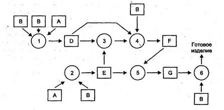 Собираемое изделие состоит из двух узлов типа А, пяти узлов типа В и трех узлов типа С. Технологическая схема операции сборки приведена на рисунке. Окружности представляют операции сборки, квадраты -т исходные и собираемые узлы, стрелки определяют последовательность сборки.