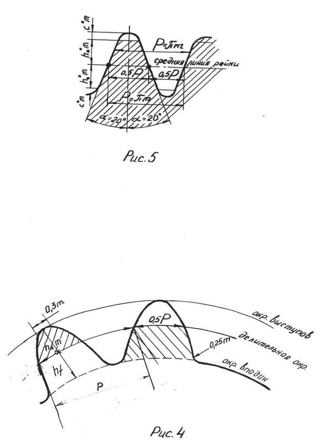 При нарезании зубчатых колес методом обкатки инструмент изготовляется либо в виде колеса с эвольвентными профилями зубьев (так называемый долбяк), либо – зубчатой рейки с прямолинейными профилями зубьев (так называемая гребенка). В процессе нарезания зубчатого колеса заготовке и инструменту сообщается такое относительное движение, какое они имели бы, находясь в зацеплении. Инструмент имеет дополнительное возвратно-поступательное движение вдоль оси колеса, во время осуществления которого режущая кромка инструмента вырезает на заготовке профиль зуба. Из рис.5 видно, что шаг рейки имеет одинаковую величину по любой прямой (0-0 или I-I), параллельной основанию рейки. Можно провести такую линию 0-0, по которой толщина зуба равна ширине впадины. Эта линия называется модульной прямой рейки. Для того, чтобы нарезать нулевое колесо, необходимо установить гребенку так, чтобы модульная прямая ее была удалена от центра заготовки на расстояние радиуса делительной окружности r, т.е. чтобы делительная окружность заготовки обкатывалась без скольжения по модульной прямой. Тогда на нарезаемом колесе получатся зубья, толщина которых по делительной окружности будет равна ширине впадины.