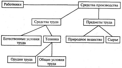 Производство включает три разнородных фактора (лат. factor - делающий, производящий). Рассмотрим их в натурально-вещественном виде, который свойствен всякому обществу. Первый фактор - человеческий. Для производства всегда нужны люди, имеющие необходимые знания и трудовые навыки. Труд в материальном производстве - это целесообразная деятельность, в которой люди с помощью созданных ими средств изменяют предметы природы, приспосабливая их для удовлетворения своих потребностей. Второй фактор - вещественный - средства труда. К ним относятся те материальные вещи, с помощью которых люди создают полезные блага. В состав средств труда входят естественные условия производственного процесса (например, вода, используемая, скажем, на гидроэлектростанциях или в мелиоративных сооружениях для хозяйственных целей) и техника - искусственные, созданные человеком средства труда. В свою очередь, они включают орудия труда (инструменты, машины, оборудование, аппараты химического производства и т. п.), благодаря которым исходное природное вещество преобразуется в полезные блага, а также общие материальные условия труда (производственные здания, каналы, дороги и т. д.). Третий фактор - тоже вещественный - предмет труда. Это вещь или совокупность вещей, которые человек приспосабливает для своих нужд. Предметы труда также подразделяются на вещество природы, которое не подверглось обработке (например, угольный пласт в шахте, руда в руднике), и на сырье (сырые материалы), которое претерпело воздействие труда человека (отбитые из пласта уголь и руда, направляемые для дальнейшем переработки). Все три фактора связываются воедино с помощью технологии. Технология - совокупность знаний о способах и средствах проведения производственных процессов. Внутреннюю структуру производства можно наглядно представить на рис. 1.3. Все указанные факторы (или ресурсы производства) в каждый данный момент времени ограничены по отношению к потребностям. Эта ограниченность может быть: абсолютной (ресурсы вообще невозможно увеличить) и относительной (факторы можно умножить, но в меньшей степени по сравнению с ростом потребностей).