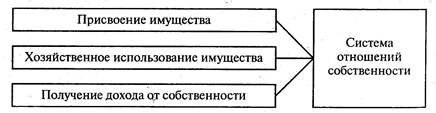 В каждом экономическом отношении собственности имеются две стороны: субъект (собственник) и объект (имущество). Это отношение можно отобразить в формуле “субъект (собственник) имущество (совокупность вещей и материальных ценностей) иные субъекты (другие владельцы или несобственники)”. Отношения присвоения распространяются главным образом на такое. имущество, от которого непосредственно зависит хозяйственная деятельность. В его состав входят факторы производства (и материальные блага, и плоды интеллектуального труда). Всестороннее изучение собственности позволяет ответить на три главных социально-экономических вопроса: 1. Кто (какие субъекты хозяйствования) обладает экономической властью - присваивает факторы и результаты производства? 2. Какие экономические связи способствуют лучшему использованию имущества? 3. Кому достаются доходы от хозяйственной деятельности? В соответствии с этим система экономических отношений собственности включает следующие элементы: а) присвоение факторов и результатов производства; б) хозяйственное использование материальных и иных средств и в) получение дохода от собственности (рис. 3.1).