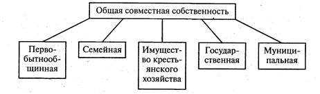 Рис. 3.5. Формы общей совместной собственности а) первобытнообщинная; б) семейная (в части совместно нажитого супругами имущества); в) имущество членов крестьянского хозяйства; г) государственная; д) муниципальная. Что такое общее совместное присвоение каждый, пожалуй, знает на примере семейного достояния, находящегося в совместно нажитой собственности. К нему могут относиться жилой дом (или квартира), дача (или садовый дом), насаждения на земельном участке, предметы домашнего хозяйства и иное имущество. Если семья ведет трудовое хозяйство, то она может, скажем, завести мастерскую или другое малое предприятие, приобрести машины, оборудование, транспортные средства, сырье, материалы и другое имущество, необходимое для самостоятельного хозяйствования.