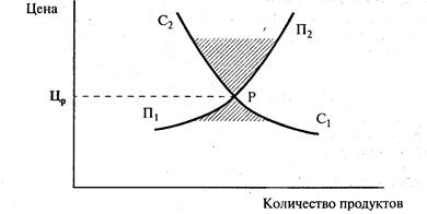 где изображены пересекающиеся кривые спроса и предложения. Здесь рассматриваются обобщенные данные о ценах и количествах продуктов, пригодные для любых рыночных ситуаций (в отличие от рис. 6.4). На рис. 7.1 отображены три основных уровня рыночной цены. Они характеризуют свойственное свободному рынку стихийное колебание спроса, предложения и цен. Первый уровень: нормальная цена. Это - равновесная цена, которая устанавливается, когда спрос и предложение уравновешиваются в точке Р. Спрашивается: происходит ли в данном случае конкурентное сражение среди всех продавцов и покупателей? Вполне очевидно, что такого сражения нет. Ибо цены, предлагаемые всеми субъектами рынка, совпадают. Второй уровень: выше величины равновесной цены. В этом случае предложение благ превышает спрос на них. В итоге в рыночном пространстве образуется зона избытка товаров (сектор П2- Р- С2 на рис 7.1). Несомненно, что в данный момент конкуренция обостряется в рядах продавцов, что раскалывает их единство. Кто может победить в этом междуусобном сражении? Очевидно, “выигрывает” тот продавец, который реализует продукты по ценам, более близким к равновесной цене. Удешевление продукции расширит сбыт его изделий. Тогда возникает своеобразная “цепная реакция”: расширяется продажа товаров по более низким ценам все возрастающим числом продавцов. Стало быть, усиление конкуренции среди продавцов способствует понижению чрезмерно высоких цен, увеличивает сбыт продукции, что приводит рыночную цену к равновесному уровню. Третий уровень: ниже величины равновесной цены. Это означает, что спрос превышает предложение. Следствием того является возникновение зоны дефицита товаров (сектор С1 - Р - П1 на рис. 7.1). Тогда, несомненно, усиливается конкуренция среди покупателей. Верх среди них одерживает тот, кто станет покупать товары по более дорогой цене. И в этом случае возникает “цепная реакция”, но другого характера. Увеличивается приобретение продуктов все возрастающим числом покупателей за более высокую цену. Значит, обострение конкуренции среди покупателей влечет за собой повышение очень низких цен, устраняет товарный дефицит, что с иной стороны приводит рыночную цену к уровню равновесной цены. Сейчас можно сделать обобщающие выводы об экономической роли конкуренции. Закон конкуренции оказывает более сильное воздействие на поведение субъектов рынка по сравнению с законами спроса и предложения. Свободная конкуренция как бы заставляет чрезмерно высокие и очень низкие цены двигаться к точке равновесия. Это центростремительное движение ведет в конечном счете к равенству противоборствующих сторон. Прямая причастность рыночной состязательности к образованию равновесной цены и равновесного количества товаров связана с правилами конкурентной “игры”. Конкуренция выполняет троякую роль. Во-первых, благодаря соперничеству утверждаются общественно нормальные условия производства и обращения. Во-вторых, рыночная состязательность прокладывает дорогу всему новому, передовому. В-третьих, разрушаются и устраняются с рыночной арены все неэффективные и отсталые хозяйства. Вследствие всего этого в обществе происходит определенное расслоение. Выделяются те, кто преуспевает, опираясь на технические, организационные и экономические достижения. Имеются и опустившиеся ниж