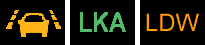 Индикатор системы отслеживания полосы движения (Lane Departure Warning Indicator — LDW, Lane Keeping Assist — LKA, или Lane Departure Prevention — LDP). Желтый мигающий цвет индикатора предупреждает о том, что автомобиль смещается со своей полосы влево или вправо. Иногда сопровождается звуковым сигналом. Желтый немигающий указывает на неисправность. Зеленый система включена.
