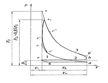 На ділянці 1 - r - 4 - а - 2 впускається свіжий заряд. У бензинових карбюраторних і газових ДВЗ і в ДВЗ з впорскуванням легкого палива у впускний колектор в циліндри двигуна надходить суміш повітря з паливом або газом – горюча суміш. У циліндрах до неї домішуються залишкові гази від попереднього робочого циклу, внаслідок чого утворюється робоча суміш. У ДВЗ з впорскуванням легкого палива безпосередньо в циліндр у ньому також утворюється робоча суміш. На ділянці а – 2 – с/ - с// стискується робоча суміш. На ділянці а - 2 - с/ цей процес політропний. У точці с/ робоча суміш запалюється від електричної іскри і тиск починає швидко підвищуватися до точки с//. В розрахунковому циклі згоряння закінчується в точці z і в цей точці тиск продуктів згоряння досягає найбільшого значення рz. Але в дійсному циклі тиск газів не досягає розрахункового значення рz, оскільки швидкість згоряння робочої суміші скінчена і за період її згоряння поршень встигає переміститися від в.м.т. до точки с///; тому об’єм надпоршневого простору збільшується. Фактичний максимальний тиск при згорянні приймається рівним рzд =0, 85 рz. (4.1) Тому згоряння в дійсному циклі відбувається на ділянці с - с// - zд - с///, причому на ділянці zд - с/// має місце так зване догоряння, яке помітно не впливає на тиск газів. На ділянці zД - с/// -3 - b/ відбувається розширення продуктів згоряння, на ділянці zд - с/// - 3 воно політропне. Після початку відкривання випускного клапана (точка 3) тиск в циліндрі швидко спадає. На ділянці 3 - b/ - r - 4 - випускаються відпрацьовані гази. Процеси впуску свіжою заряду і випуску відпрацьованих газів називаються процесами газообміну.