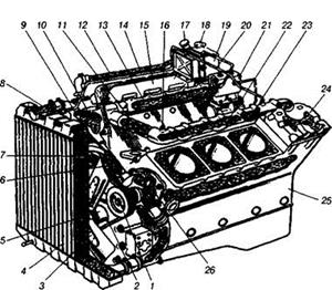 Рис. 1. Схема системи охолодження двигуна КамАЗ-740: 1 — шків рідинного насоса; 2 — пас приводу насоса і генератора; 3 — вентилятор; 4 — радіатор; 5 — шків вентилятора; 6 — перепускний патрубок; 7 — нагнітальний патрубок; 8 — верхній патрубок; 9 — термостат; 10 — водорозподільна коробка; 11 — сполучна труба; 12 — підвідна труба; 13 — труба права; 14 — відвідна трубка радіатора; 15 — впускний трубопровід; 16 — датчик контрольної лампи перегріву двигуна; 17 — заливна горловина; 18 — пробка з пароповітряним клапаном; 19 — розширювальний бачок; 20 — відвідна труба; 21 — компресор; 22 — трубка лівої відвідної труби; 23 — труба ліва; 24 — головка циліндрів; 25 — блок циліндрів; 26 — відцентровий насос