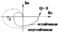 Произведём подстановку s = jw в знаменатель ПФ. При изменении частоты w вектор A(jw), изменяясь по величине и направлению, будет описывать своим концом в комплексной плоскости некоторую кривую, называемую кривой (годографом) Михайлова. Критерий Михайлова формулируется следующим образом: для того, чтобы система автоматического управления была устойчива, необходимо и достаточно, чтобы вектор А(jw) кривой Михайлова при изменении частоты w от 0 до +¥ повернулся, нигде не обращаясь в нуль, вокруг начала координат против часовой стрелки на угол π n/2, где n-порядок характеристического уравнения А(l) =0. 3.3.2 Критерий Найквиста Критерий устойчивости Найквиста позволяет судить об устойчивости замкнутой системы по виду амплитудно-фазовой характеристики разомкнутой системы Wр(jw) = B(jw)/A(jw). Если система в разомкнутом состоянии устойчива, то и замкнутая система будет устойчивой, если амплитудно-фазовая характеристика разомкнутой системы не охватывает точку (− 1, j0).