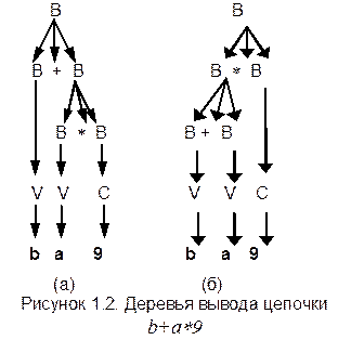Такая запись не очень удобна, так как по ней трудно определить в какой части сентенциальной формы проводилась замена и какой нетерминал породил тот или иной символ. Более наглядна запись в виде дерева вывода или синтаксического дерева, представленного на рисунке 1.2 (a). Для того чтобы понять, что выведено, применяем левый обход дерева. Идем от корня по крайней левой ветви, дойдя до терминала (конца ветви), выписываем его, возвращаемся до ближайшего разветвления и идем по самой левой из тех, которые еще не пройдены. Если все ветви данного узла уже исчерпаны, возвращаемся к предыдущему разветвлению, если оно есть. Продолжая таким образом, получим в результате b+a*9. Кроме вывода (1.1.2) по данному дереву можно получить целую серию выводов, например, BÞ B+BÞ B+B * BÞ B+B * CÞ V+V * 9Þ B+V * 9Þ B+a * CÞ V+a * CÞ b+a * 9 (1.1.3)