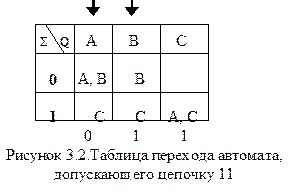 Недетерминированный автомат (НДА) - это автомат, где значение функции переходов d - не отдельное состояние, как в детерминированном автомате (ДА), а множество состояний. В общем случае у НДА может быть также не одно, а множество начальных состояний (если начальное состояние не единственно, то эти состояния при изображении таблицы переходов будут помечаться стрелкой). НДА изучается, так как для заданного множества иногда легче найти недетерминированное описание. Говорят, что НДА допускает входную цепочку, если он позволяет связать одно из его начальных состояний с одним из допускающих. Так автомат, представленный на рисунке 3.2, допускает цепочку 11, так как