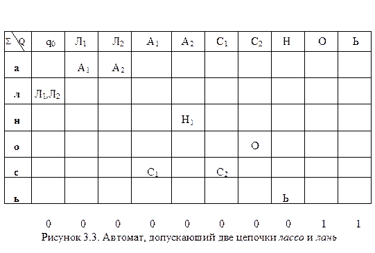 На рисунке 3.3 представлен еще один НДА с входным алфавитом { а, л, н, о, с, ь }, который допускает только две цепочки лассо и лань.