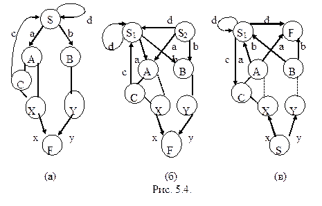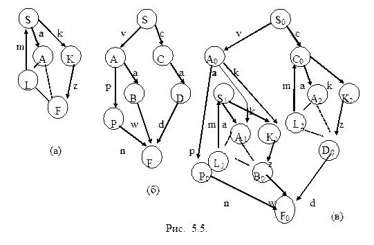 Именно эту, вторую начальную вершину без возвратов и совмещают с A0. Результаты этих преобразований приведены на рис. 5.5. (в), отражающем грамматику языка, полученного в результате указанной подстановки.