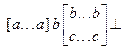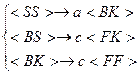 Выполним формальную процедуру операции пересечения. Определим грамматику G=( VN, VT, R, < SR>) языка L = L1Ç L2. Для того, чтобы проконтролировать наше решение вначале определим вид цепочек, как заданных языков, так и языка - результата, благо простота выбранных грамматик позволяет легко это сделать. Цепочки языка L1 могут содержать в начале произвольное количество символов a, обязательный символ b или d, затем, возможно, серию символов b и (или) c и в завершении символ û ë. Схематично цепочку языка L1 можно представить в виде Заметим, что S Í S1Ç S2. Построение грамматики-пересечения напоминает построение детерминированной формы А-грамматики. В качестве элементов нового множества нетерминалов выбираются пары нетерминалов исходных грамматик типа < SR>, < SQ>, < SM>, < CM>, < CQ> и т.п. В результате построения правил грамматики-пересечения часть этих нетерминалов может быть исключена, как внутренние или внешние тупики. Схема построения правил новой грамматики состоит в том, что рассматриваются только те пары нетерминалов и те их альтернативы, которые имеют одни и те же терминалы в качестве продолжения цепочки. В результате мы получим грамматику < SR> ® a< SQ> ½ b< CM> < SQ> ® b< CQ> < CQ> ® b< CQ> ½ û ë < FF>. Заметим, что нетерминал < CM> не имеет общего продолжения, является внешним тупиком и его можно исключить вместе с правилом < SR> ® b< CM>. То есть операция пересечения L=L1Ç L2 определяется следующим образом: G=< VT1Ç VT2, VN={< A1A2>, A1Î VN1, A2Î VN2}, < S1S2>, R={< AB> ®a< CD>, если в исходной грамматике G1 присутствует правило вида A®aC: A, CÎ VN1, B®aD, B, DÎ VN2} >. В результате такого построения получается язык, включающий множество цепочек, принадлежащих языку L1 и L2. Действительно: а) если jÎ L1, L2 Þ существует вывод в L1 и L2 Þ в L1: j=ab…f, значит существует вывод S1aA1bB1…fF1 в G1 и вывод в G2: S2aA2bB2…fF2.