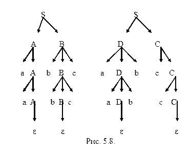 Здесь можно устранить неоднозначность, если вместо предложенных правил с двухсторонней рекурсией использовать одностороннюю, то есть использовать правила A ® AB ½ B и B ® a или правила A ® BA ½ B и B ® a. Другой пример неоднозначности - правило A ® AaA, так как цепочку AaAaA можно получить по двум разным деревьям вывода. Пара правил A ® aA ½ Ab тоже создает неоднозначность, - цепочка aAb имеет два разных левых вывода A Þ aA Þ aAb и A Þ Ab Þ aAb. Все перечисленные примеры, так или иначе, связаны с двухсторонней рекурсией. Более тонкий пример - пара правил A ® aA ½ aAbA, по которым цепочка aaAbA имеет два вывода A Þ aAbA Þ aaAbA и A Þ aA Þ aaAbA. Если при двухсторонней рекурсии средством борьбы с неоднозначностью является устранение рекурсии с одной из сторон, то в последнем случае поможет левая факторизация. Из приведенных примеров ясно, что определенная выше неоднозначность - это свойство грамматики, а не языка. Для некоторых неоднозначных грамматик можно построить эквивалентные им однозначные грамматики. Пример 5.6. Рассмотрим грамматику из примера 5.5. Эта грамматика неоднозначна потому, что else можно ассоциировать с двумя различными then. Неоднозначность можно устранить, если связать else с последним из предшествующих ему then, как на рис. 5.6 (б). Для этого введем два нетерминала S1 и S2 с тем, чтобы S2 порождал только полные операторы вида if-then-else, а S1 - операторы обоих видов. Правила новой грамматики имеют вид S1 ® if b then S1 ½ if b then S2 else S1 ½ a S2 ® if b then S2 else S2 ½ a Тот факт, что слову else предшествует только S2, гарантирует появление внутри конструкции then-else либо символа a, либо другого else. Таким образом, структура, изображенная на рис. 5.6 (а), здесь не возникает. КС-язык называется неоднозначным (или существенно неоднозначным), если он не порождается никакой однозначной КС-грамматикой. С первого взгляда не видно, существуют ли вообще неоднозначные КС-языки, но нашим следующим примером и будет такой язык. Пример 5.7. Пусть L= {a i b j c k ½ i = j или j = k }. Этот язык неоднозначен, что можно строго доказать. Интуитивно же это объясняется тем, что цепочки с i = j должны порождаться группой правил, отличных от правил, порождающих цепочки с j = k. Тогда, по крайней мере некоторые из цепочек с i = j = k должны порождаться обеими механизмами. Одна из КС-грамматик, порождающих L, такова: S ® AB ½ DC A ® aA ½ e B ® bBc ½ e C ® cC ½ e D ® aDb ½ e Ясно, что она неоднозначна и на рис. 5.8 представлены два дерева вывода цепочки aabbcc. Проблема, порождает ли данная КС-грамматика однозначный язык (т.е. существует ли эквивалентная ей однозначная грамматика), алгоритмически неразрешима. Но для некоторых больших подклассов КС-языков известно, что они однозначны. Именно к этим подклассам и относятся все созданные до сих пор языки программирования.