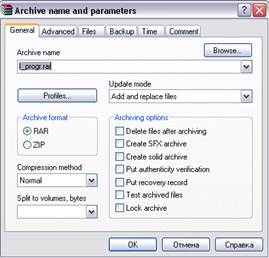 Добавление файлов в архив (создание архива). Надо воспользоваться кнопкой Add панели инструментов или командой Commands/Add files to archive. В результате будет отображено диалоговое окно Archive name and parameters, содержащее несколько вкладок. Вкладка General (Общие) содержит команды для установки параметров архива: - Поле Archive name позволяет задать имя создаваемого архива. Если необходимо задать иное место расположения архива, то следует воспользоваться кнопкой Browse (Обзор), задав в соответствующем окне требуемый путь. Также с помощью данной кнопки можно выбрать один из имеющихся на диске архивов, чтобы добавить в него выбранные файлы (в этом случае создание нового архива выполняться не будет). - Команды кнопки Profiles (Профили) можно сохранить установленные параметры таким образом, что они будут автоматически использоваться при каждом последующем обращении к данному диалогу (т.е. при добавлении файлов в архив), или восстановить настройки, которые были заданы по умолчанию. - Группа Archive format позволяет задать один из форматов для создаваемого архива: RAR или ZIP. - Раскрывающийся список Compression method устанавливает метод сжатия файлов. - В списке Update mode задается режим добавления, замены или обновления имеющихся в архиве файлов. -