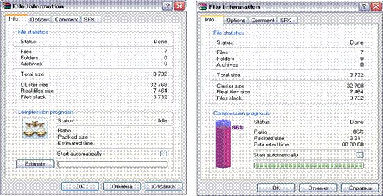 Оценивание сжимаемости файлов. Перед добавлением файлов в архив полезно знать, насколько будут сжаты выбранные файлы. Для этого необходимо выделить требуемые файлы и дать команду Commands/Show info или нажать кнопку Info панели инструментов. Далее, в появившемся диалоговом окне следует нажать на кнопку Estimate (Оценить). Результатом выполнения оценки будет окно с графической иллюстрацией возможной степени компрессии.