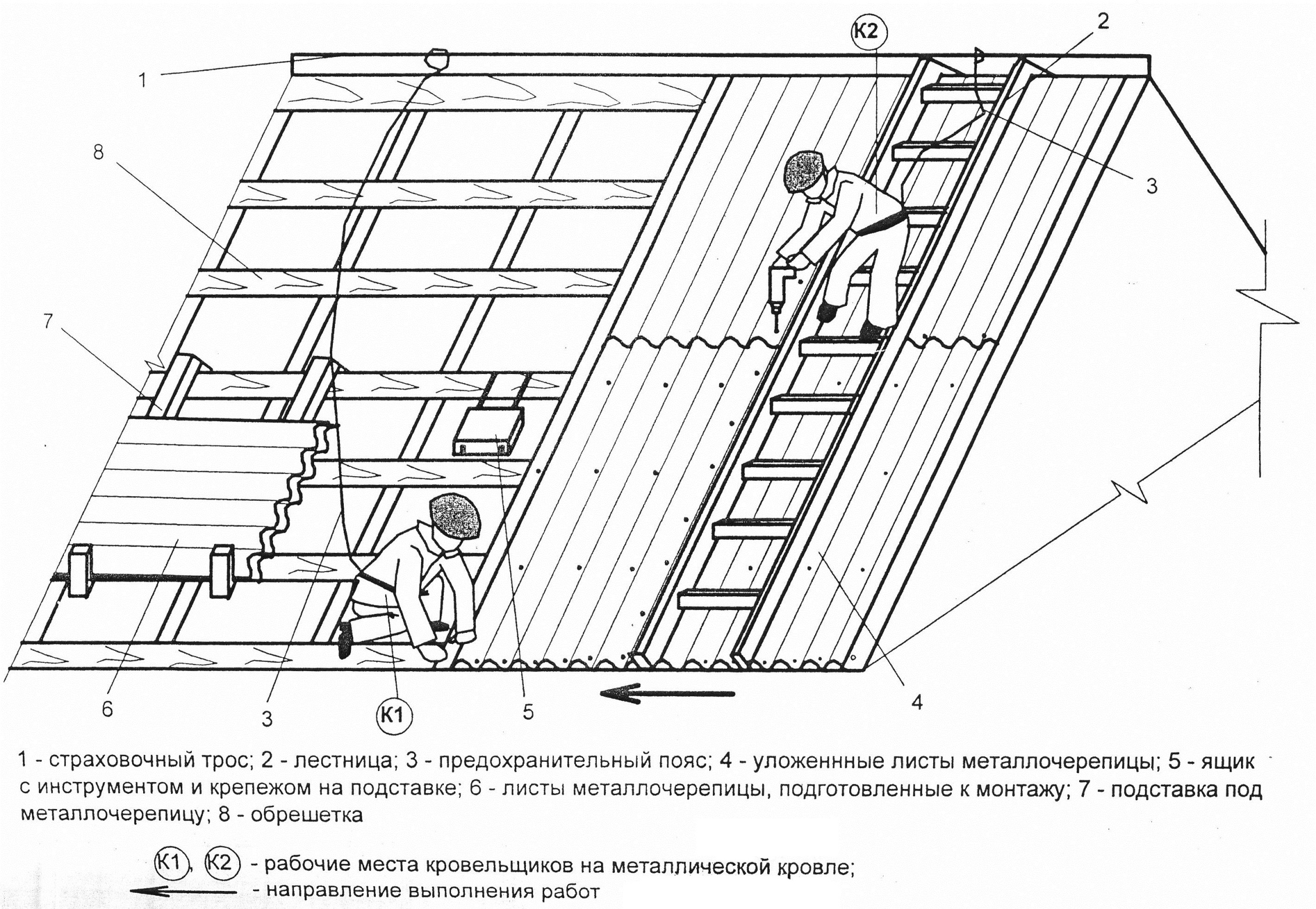 - осуществить входной контроль качества изделий и материалов; - осуществить входной контроль качества изделии и материалов; - обеспечить звенья рабочих необходимыми для работы средствами индивидуальной защиты; - проверить исправность такелажных приспособлений; - обеспечить безопасный доступ рабочих на кровлю; - обозначить опасную зону сигнальным ограждением и хорошо видимыми предупредительными (запрещающими) знаками; - провести инструктаж рабочих по технике безопасности, охране труда и окружающей среды под роспись в журнале, ознакомить рабочих и ИТР с проектными решениями по устройству кровли, ППР и настоящей типовой технологической картой. 4.1.2. Перед началом работ по устройству кровель из металлочерепицы производитель работ должен проверить исправность оборудования, инструмента и защитных средств, ознакомить рабочих с условиями производства работ, принятыми мерами безопасности, границами участка работ согласно ППР; в процессе работ должен осуществлять контроль за работой звеньев. 4.1.3 Разгрузка материалов и подача контейнеров с металлочерепицей и комплектующими изделиями на рабочее место осуществляется, краном, используемым на конкретном объекте. Для доставки листов металлочерепицы на рабочее место применяют специализированные контейнеры. Максимальный вес контейнера с материалами, подаваемого на деревянную обрешетку, составляет 80 кг. Материалы размещают на кровле в местах, предусмотренных в ППР, в количестве, достаточном для работы в течение часа; в дальнейшем запас материалов пополняется. Перемеще