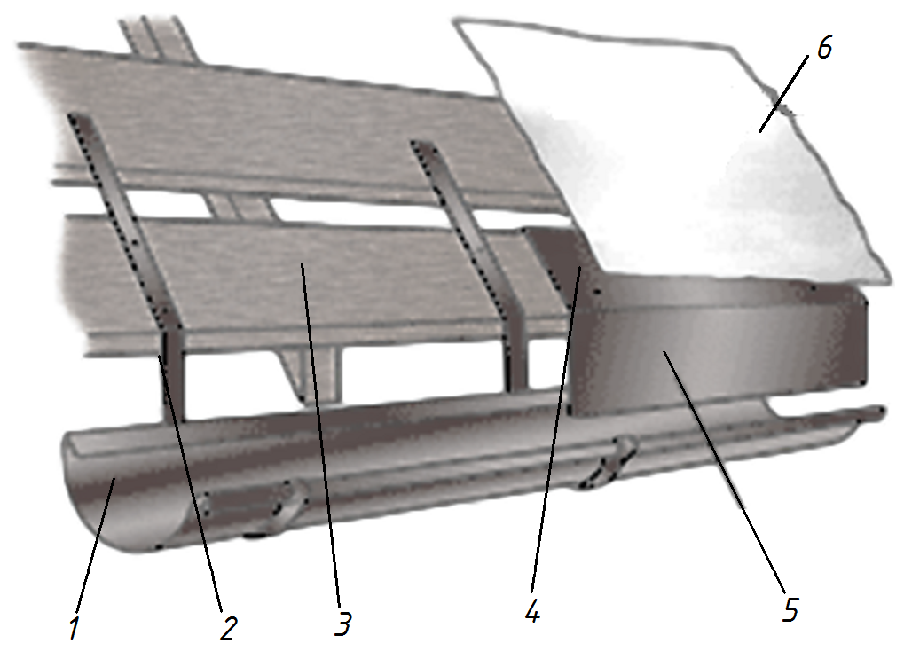 1-водосточный желоб; 2-держатель желоба; 3-деревянная обрешетка; 4-самонарезающиеся шурупы; Рис.5 - Схема у