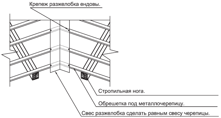 Устройство ендов выполняют в следующей технологической последовательности: - до монтажа основного покрытия из металлочерепицы, в местах ендов снизу вверх устанавливают нижнюю планку ендовы и крепят ее самонарезающими шурупами с шагом 300 мм к ранее выполненному сплошному дощатому настилу с гидроизоляционным слоем; при стыковке планок нахлестка составляет 100-150 мм; - после монтажа листов металлочерепицы, стыки между листами металлочерепицы и нижним листом ендовы очищают от пыли и грязи и заполняют силиконовым герметиком; - натягивают причальный шнур, на внутренний стык снизу вверх устанавливают верхнюю планку ендовы (разжелобок) строго по причальному шнуру, закрепляя ее шурупами поверх волны профиля с шагом 300-500 мм. Шляпки шурупов (заклепок) покрывают аэрозольной краской.