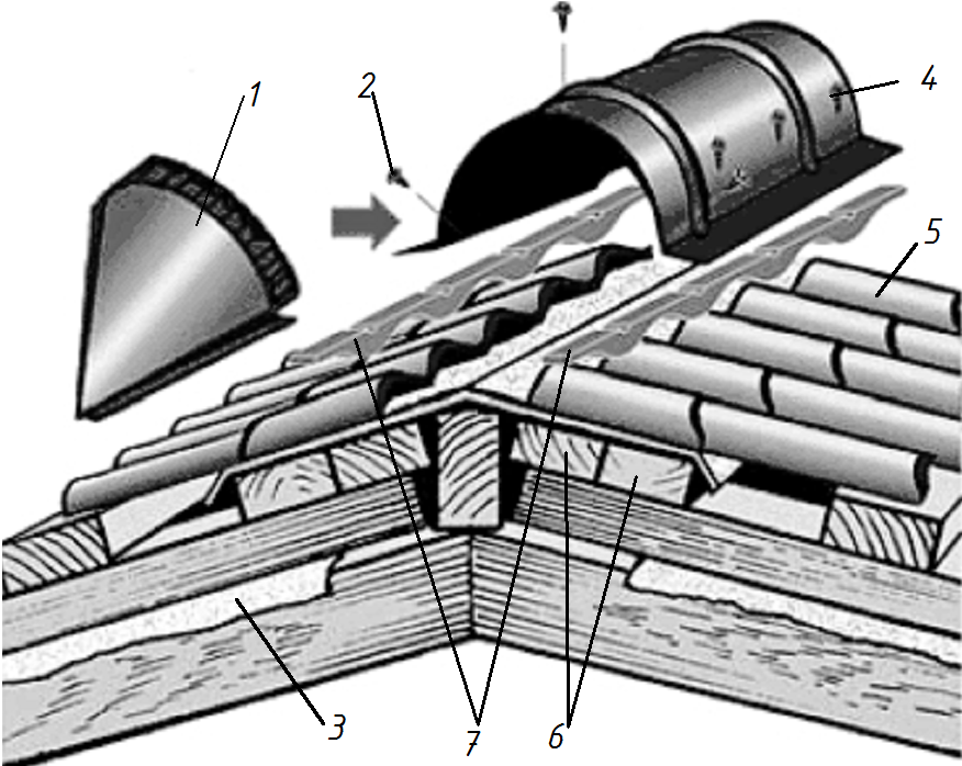 1-конусная заглушка для полукруглого конька; 2-самонарезающий шуруп; 3-гидроизоляция;