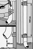 На свободные концы полукруглых желобов устанавливают и защелкивают заглушки. Свободные торцы прямоугольных желобов закрывают заглушками, которые прижимают, ставят на герметик и фиксируют заклепками. В месте соединения полукруглого желоба с водосточной трубой на расстоянии примерно 150 мм в желобе вырезают V-образное отверстие шириной 100 мм (рисунок 18а), устанавливают водосточную воронку, загибая резной фланец воронки на заднюю кромку желоба В месте соединения прямоугольного желоба с водосточной трубой делают крестообразный разрез, края которого загибают внутрь трубы или вырезают круглое отверстие диаметром 45-50 мм. В отверстие устанавливают универсальную воронку на герметике и заклепках (рисунок 18б). Воронки с водосточной трубой соединяют двумя отводами, предварительно обжимая углы входящей части отвода. Водосточные трубы отрезают до необходимой длины и крепят к стене держателями (для дерева, кирпича, металла, пластика и т. д.) на расстоянии 150-190 см друг от друга. Трубу крепят вверху, на стыке труб, если труба состоит из нескольких частей, и внизу (рисунок 19). Расстояние от нижнего края водосточной трубы до земли - не менее 300 мм.